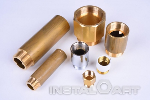 Przedłużki do łączenia i przedłużania linii instalacji wodnych i centralnego ogrzewania. Wykonane z mosiądzu MO58 metodą obróbki skrawaniem na automatach numerycznie sterowanych.
