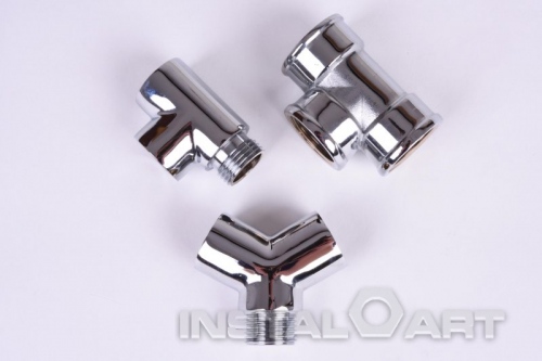 Trójniki mosiężne z trzema wylotami do tworzenia bocznych odgałęzień rurociągu w celu doprowadzenia wody w wyznaczone miejsca poboru. Można je stosować w instalacjach wodnych gdzie ciśnienie robocze wynosi maks. 10 bar, a temperatura obecnego w nich czynnika nie przekracza 95°C. Produkty dostępne w różnych konfiguracjach gwintów zewnętrznych i wewnętrznych.